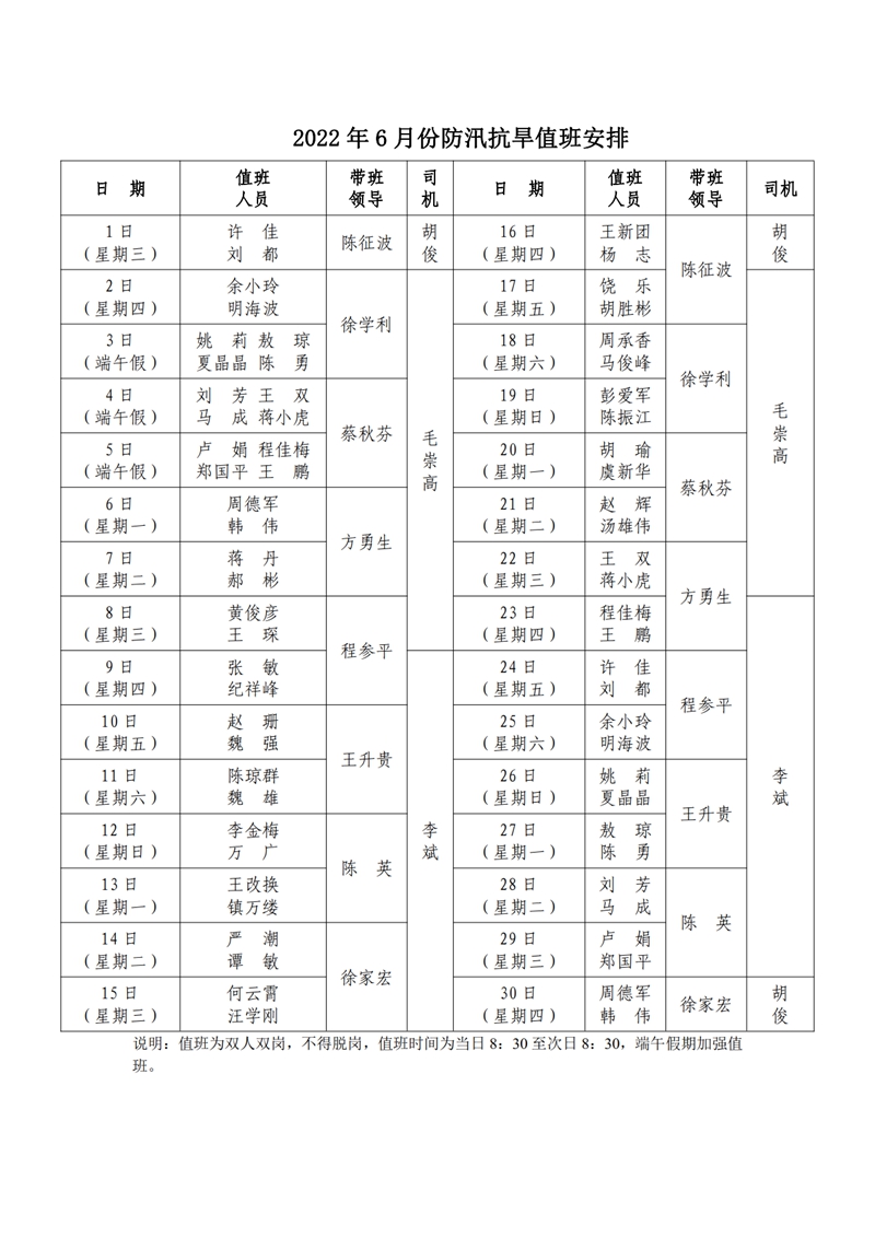 2022年6月份防汛抗旱值班安排