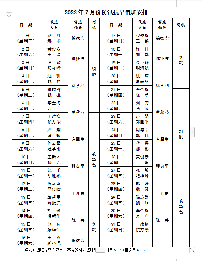 2022年7月份防汛抗旱值班安排