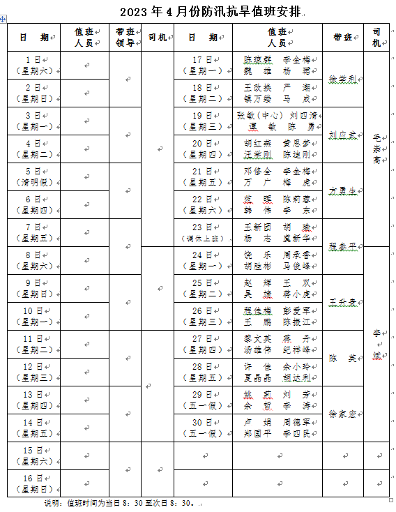 2023年4月份防汛抗旱值班安排