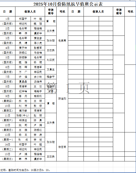 2025年10月份防汛抗旱值班公示表 - 彩票平台门户网站