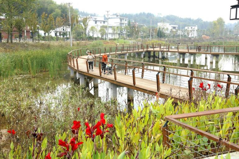因地制宜在排楼湾建起“三格化粪池+人工湿地”模式的小微水体示范基地。2019年投入3000多万元资金将位于排楼湾河道北岸、乡村公路东侧,占地面积50余亩的多年闲置土地,整合成人工湿地公园,公园里建设单元格、绿化景观、木栈道、种植池及其他配套设施。村民排放的生活污水先通过三级化粪池预处理,再利用管道集中接入人工湿地,经过细沙、石砾沉淀、过滤,微生物颗粒分解、转化,再由植物吸收净化,达到农用灌溉用水的标准。在生活污水处理系统的排水口,一股股清水顺着沟渠流入稻田。而针对零散住户,污水则采取四格化粪池的方式进行处理,格子里、花坛里栽种花叶芦竹、西伯利亚鸢尾、黄花鸢尾、香蒲、黄菖蒲等水生植物,打造“会呼吸”的人工湿地,到达净化污水尾水的效果。