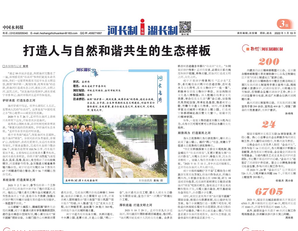 “我们要积极探索生态价值实现机制,既全域提升母亲河“颜值”,又更好更优发挥母亲河“价值”,实现生态保护、绿色发展、民生改善相统一,建设人与自然和谐共生的美丽样板。” 2021年11月11日,第十次巡河结束,在淦河入斧头湖口,孟祥伟依然深深思索。