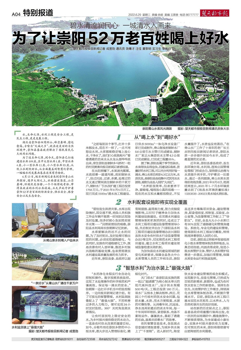 让农村居民吃上稳定安全的水,为乡村振兴提供稳定的水动力,一直是农村供水改革的重要目标。如今,分散布局在崇阳乡野的中小型水库,都大步迈入管理标准化、精细化时代。