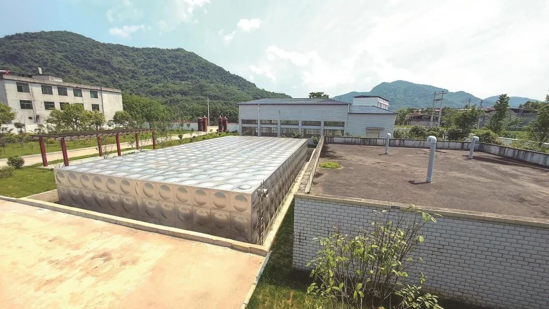 在太阳照耀下,水面波光粼粼,水流顺着一道道沟渠,流到铜钟水厂,经过沉淀、过滤、杀菌,处理过的水又通过管网流往铜钟乡的千家万户。铜钟水厂引水改扩建工程总投资1758万元,于2021年8月5日开工,现已完成1500m^3清水池工程建设、日供水5000m^3一体化净水设备厂家已完成制作,青山复线至铜钟水厂8.6公里引水主管已完成铺设,铜钟水厂至正大集团供水主管4.3公里已完成铺设,已完成工程量85%。