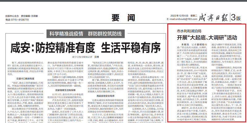 “摸清家底好干活。水利工作者的脚步就是要印在泥土上、印在山水间,通过实地调查研究发现问题解决问题,不断提升工作质效。”市水利和湖泊局主要负责人表示,下一步,各科室将对所有问题进行分类督办,明年汛前将再次开展此类检查调研,推动全市水利工作提档升级,为咸宁经济社会发展提供有力的水利支撑。