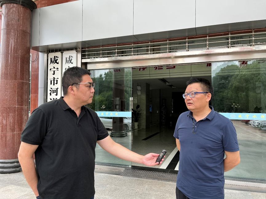 赤壁市水利和湖泊局副局长王金清接受记者采访(左)