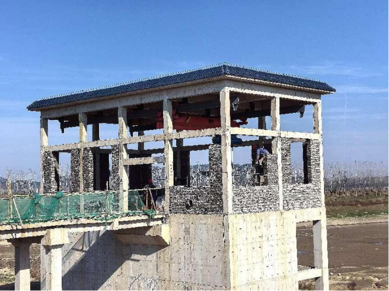 在赤壁市老河泵站不远处,新扩建的老河二站已经完成了建筑主体施工,工人们正在进行外围砌墙作业。