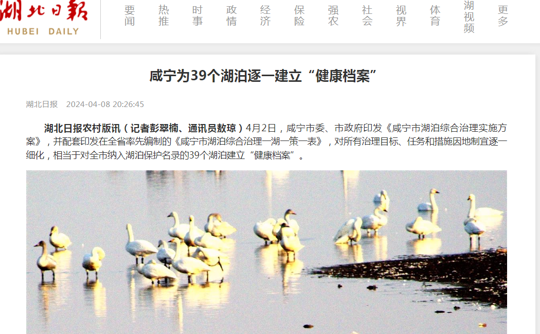 《方案》配套的《一湖一策一表》则对39个湖泊逐一明确治理目标、任务、责任单位等,治理内容主要包括湖泊岸线治理、湖泊截污控污、湖泊生态修复、河湖水系连通、数字湖泊建设等8大类24项任务。其中,重点要求按时序推进咸安区章家湖省级试点项目建设任务,将斧头湖嘉鱼县的黄沙湾、咸安区的王生茂入湖口等重污染区底泥清淤作为市级试点项目,另在嘉鱼县和赤壁市各选取一个湖泊作为县级试点,近期对大岩湖、锦湖等湖泊进行退垸还湖,远期对西凉湖、赤城湖等湖泊进行退垸还湖。