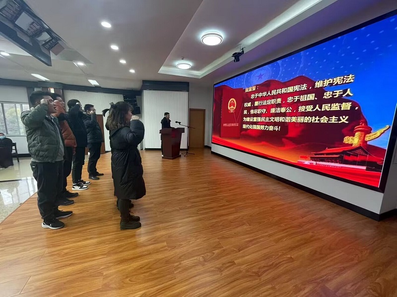 12月7日,在第九个“12·4”国家宪法日到来之际,市水利和湖泊局组织2022年我局任命的科级干部和新招录的国家工作人员进行宪法集中宣誓。在领誓人的带领下,宣誓人齐举右手,面向国徽庄严宣誓,向祖国和人民作出郑重承诺。宣誓仪式结束后,向宣誓人员发放《宪法》读本,勉励他们牢固树立宪法意识,维护宪法权威,持续加强宪法法律学习,不断提高自身法治素养。