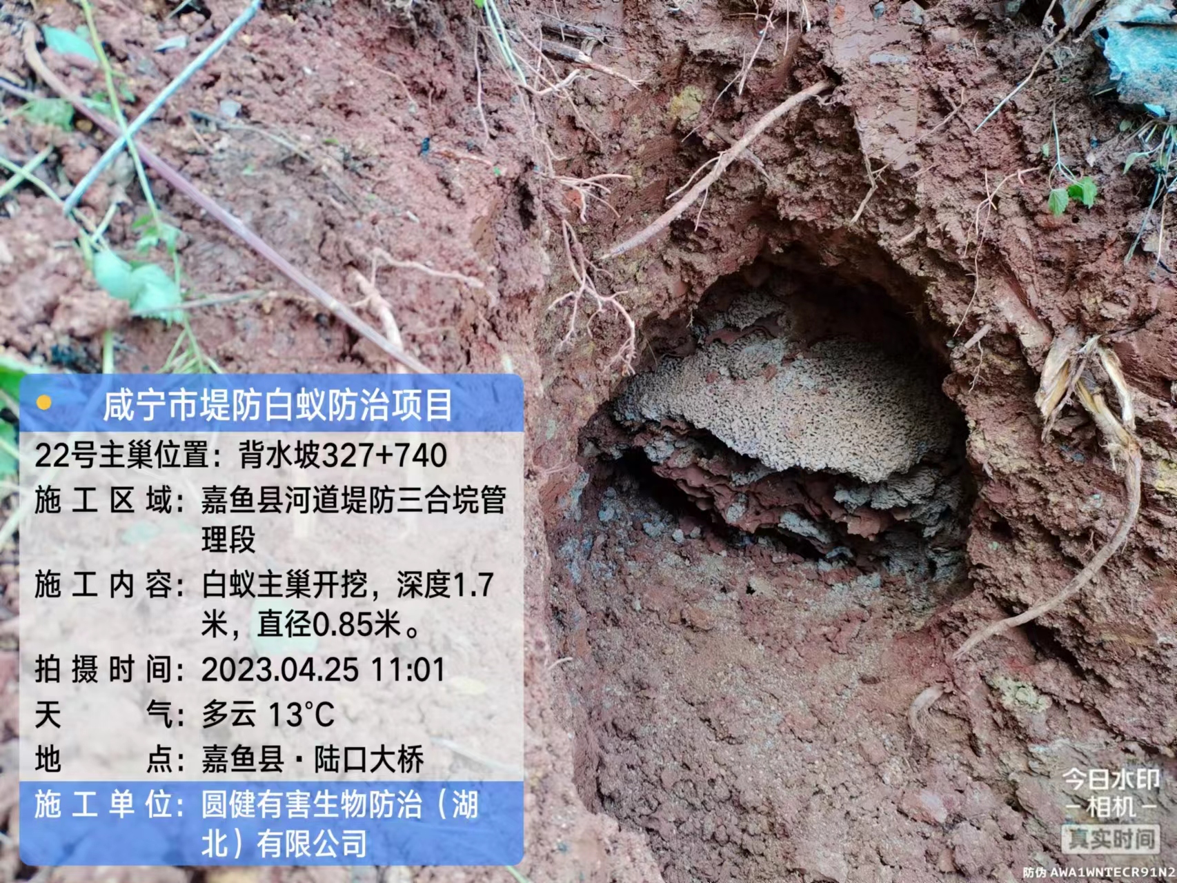 长江干堤2023年白蚁普查防治工作已于4月上旬开始,主要按照“全面普查+重点防治”的形式开展,目前已开挖蚁巢47巢,活捉蚁王、蚁后47对。现场防治技术人员在桩号327+740堤身处发现一处15年以上巢龄的蚁巢,最大开挖深度近2米,主巢直径0.85米。