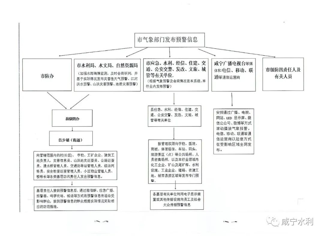 《洪涝灾害预警信息发布机制》要求,气象部门要第一时间将预警信息报送市防办和市应急、水利、自然资源、住建、交通等部门,同步报送咸宁广播电视台等媒体和三大通信运营商。市防办负责将预警信息发送到县级防办,并对口叫应受影响区域县乡领导;市水文、水利、自然资源三部门在收到气象预警并会商研判后,向影响区域发布江河洪水预警和山洪、地质灾害预警,其他部门则按照对口原则,发送县级相关部门,并按管理权限向学校、医院、旅游景点等公共场所、人员密集场所和本行业内企业等发布专门预警。县(市、区)收到预警后,要迅速通知相关镇、村做好防范,强化上下游联动,落实转移避险要求,必要时提前预置抢险力量,做好抢险准备。