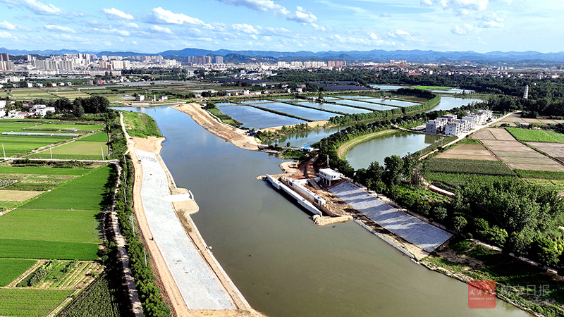 6月28日,在咸安区向阳湖镇淦河新老河道交汇处,已完成主体施工的笔峰塔气盾坝守望着周边绿色的田野,河面倒映着蓝天,成为一道特殊的风景。