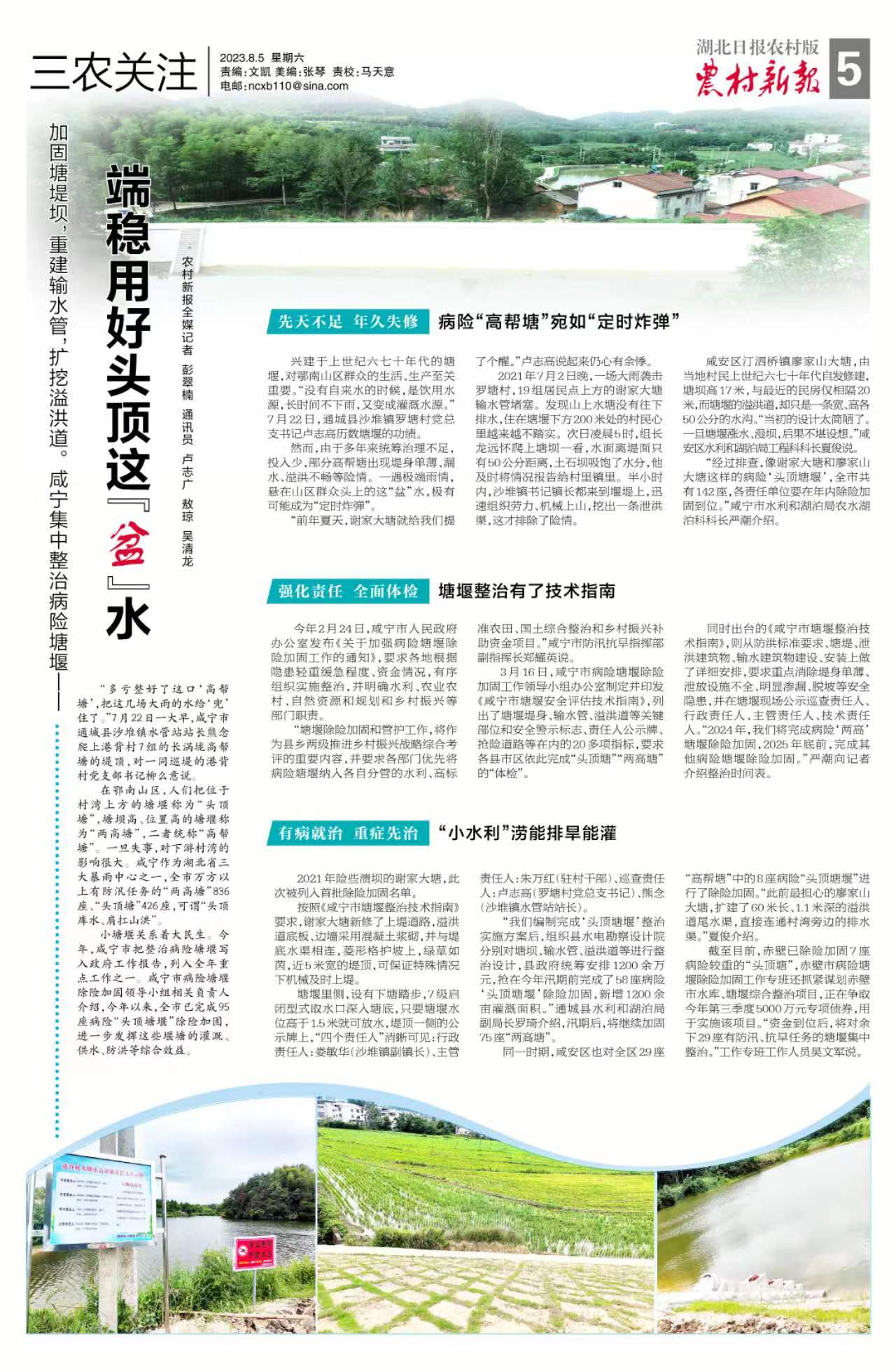 “我们编制完成‘头顶塘’整治实施方案后,组织县水电勘察设计院分别对塘坝、输水管、溢洪道等进行整治设计,县政府统筹1200余万元,抢在今年汛期前完成了58座病险‘头顶塘’除险加固,新增1200余亩灌溉面积。”通城县水利和湖泊局副局长罗琦介绍,汛期后,将继续除险加固75座“两高塘”。