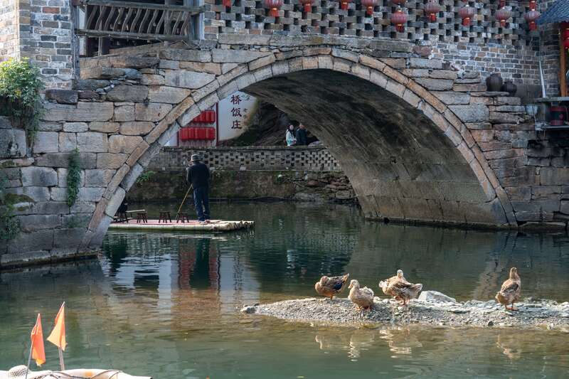 刘家廊桥下,野鸭、竹排、饭庄、人家。湖北大学 林芳灏/摄