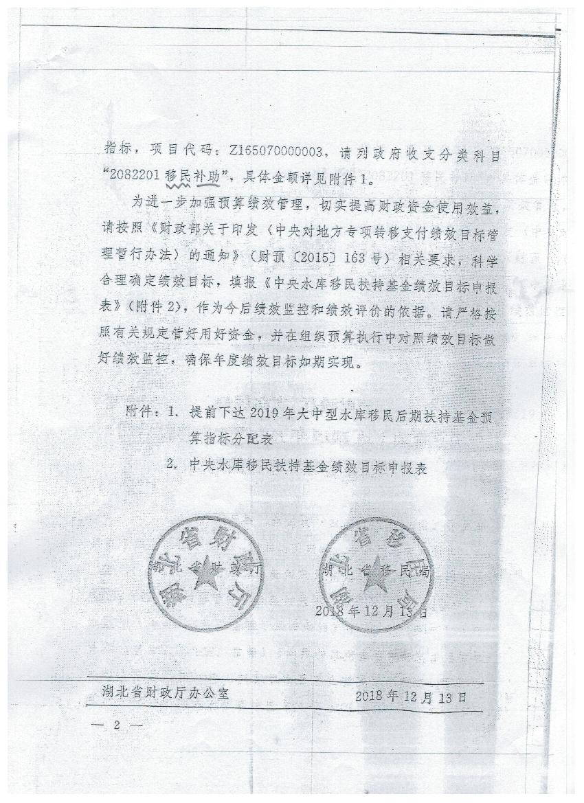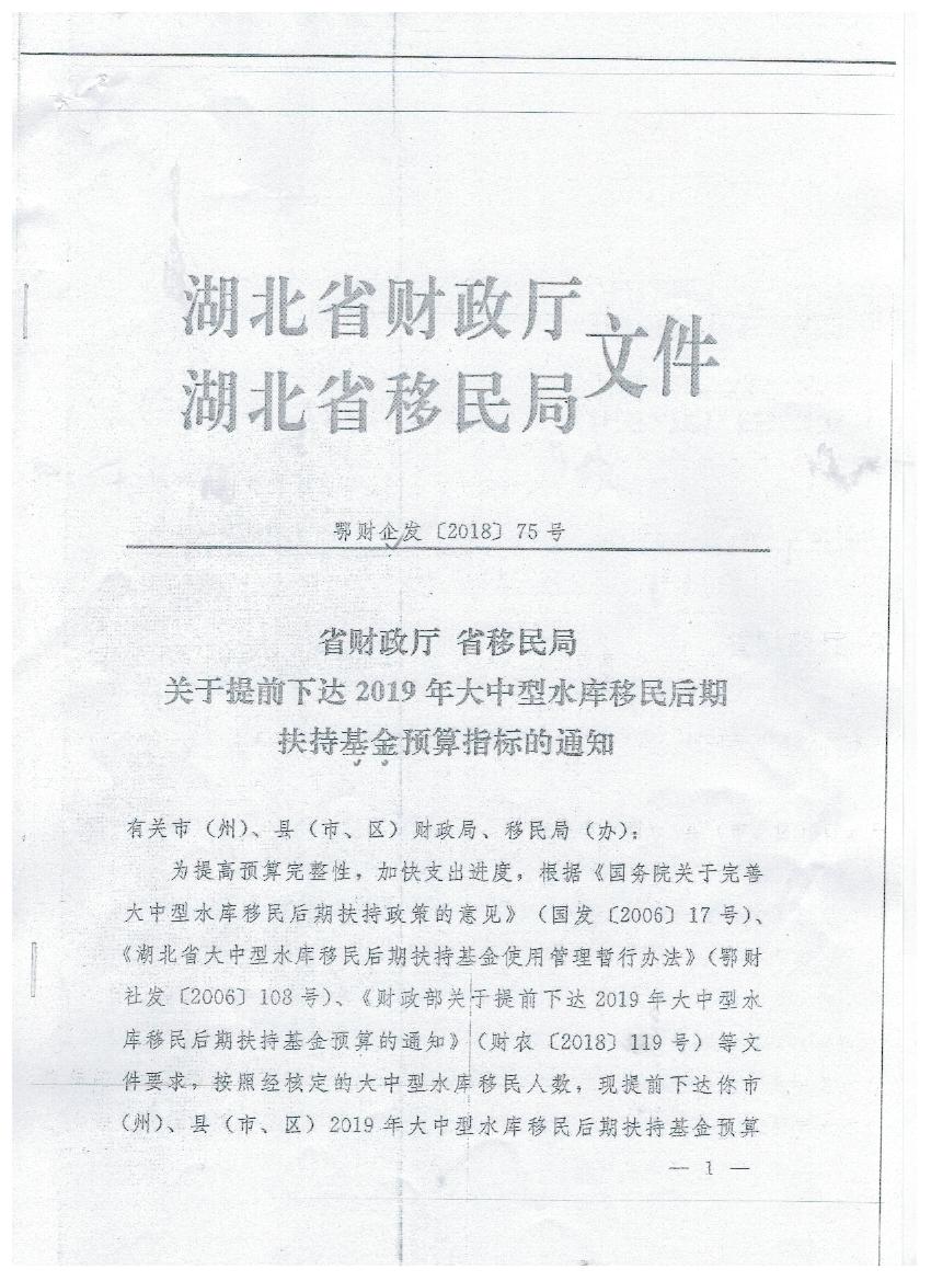 名       称: 鄂财企发75号文:关于提前下达2019年大中型水库移民后期扶持基金预算指标的通知 发布日期: 2019年06月21日
