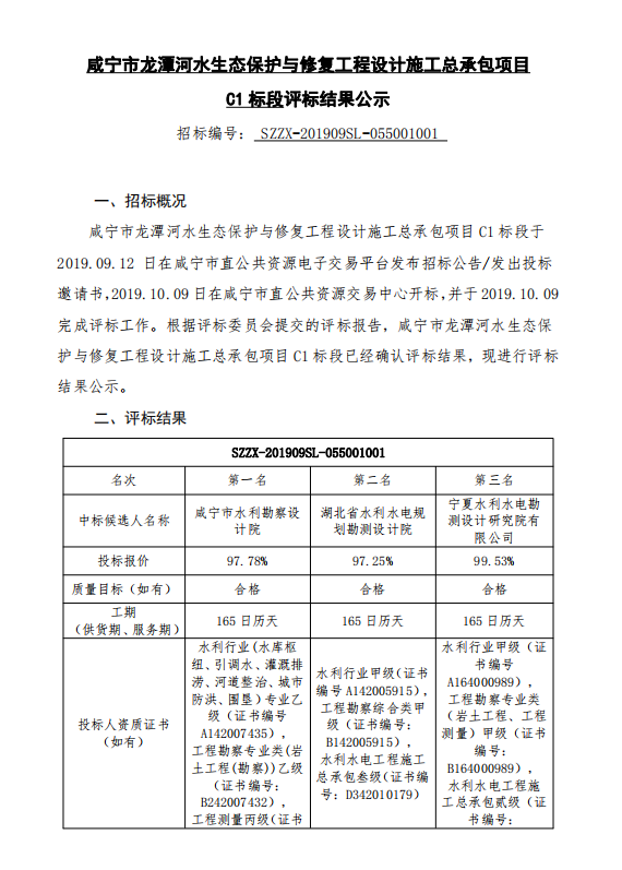彩票平台龙潭河水生态保护与修复工程设计施工总承包项目 C1标段评标结果公示