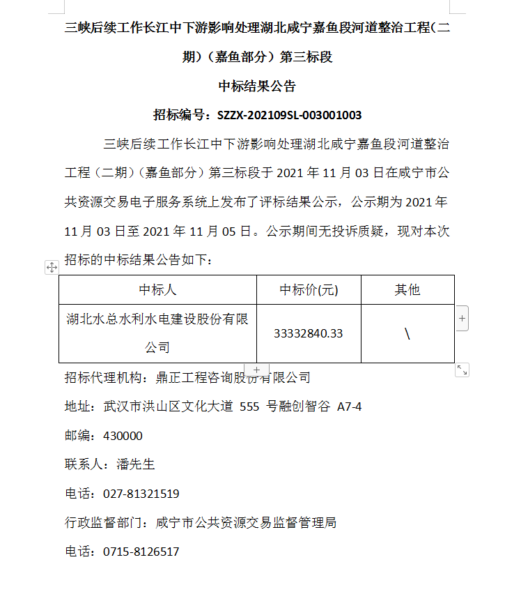 三峡后续工作长江中下游影响处理湖北咸宁嘉鱼段河道整治工程(二期)(嘉鱼部分)第三标段中标结果公告