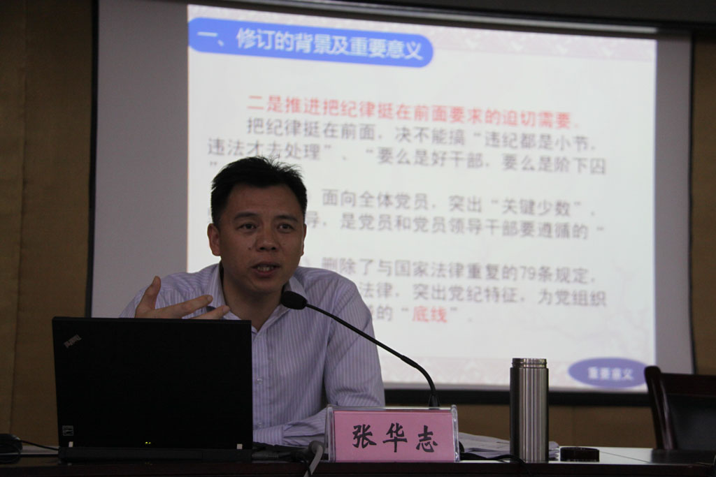 张华志同志在市纪委监察局工作近20年,在纪检监察工作方面有丰富的实践经验,对党风廉政建设和反腐败斗争的理论研究较深。讲座上,张华志从准则修订的背景及重要意义;准则修订的原则及定位;修订的亮点及作用等三个方面对新修订的《中国共产党廉洁自律准则》进行了全方位的讲解和阐述。他还为全体党员干部讲解了《中国共产党纪律处分条例》的主要内容,并提出了学好、用好法规的对策。