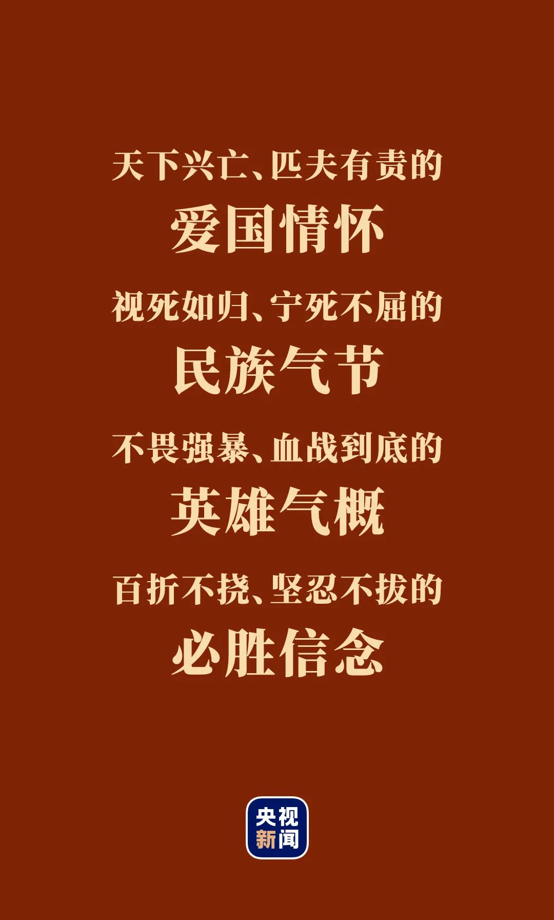 以枯草、树皮和棉絮果腹的杨靖宇,只身与敌人周旋直至牺牲;亲笔写信告谕官兵为国家民族死之决心决不改变的张自忠,战斗到生命的最后一刻;面对步步逼近的日伪军,“狼牙山五壮士”纵身跳下悬崖……中国人民以铮铮铁骨战强敌、以血肉之躯筑长城、以前仆后继赴国难,谱写了惊天地、泣鬼神的雄壮史诗。