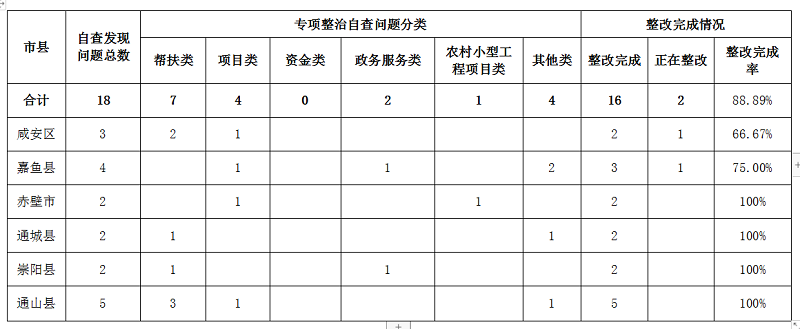 截止7月26日,全市水利系统共有204人参与自查自纠工作,自查范围全面,包括驻村帮扶和饮水安全保障、项目谋划和管护、移民直补资金、政务服务、农村小型工程项目等方面。共查摆出问题18个,其中乡村振兴领域不正之风和腐败方面问题17个,农村集体资源发包和小型工程项目管理方面问题1个,16个问题已完成整改销号,2个问题正在整改销号中。