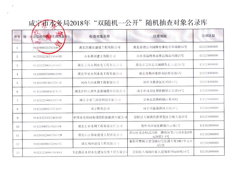 彩票平台水务局2018年“双随机一公开”随机抽查对象名录库