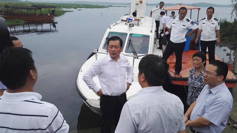 丁小强一行从咸安区向阳湖镇登船出发,绕湖一周仔细查看西凉湖围网养殖拆除后的情况,并登岸与当地渔民亲切交谈,详细了解他们上岸后的生产生活等情况。