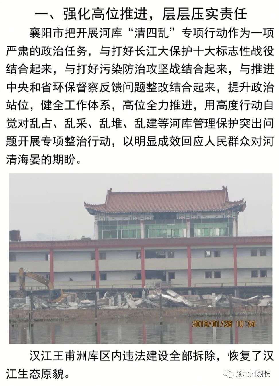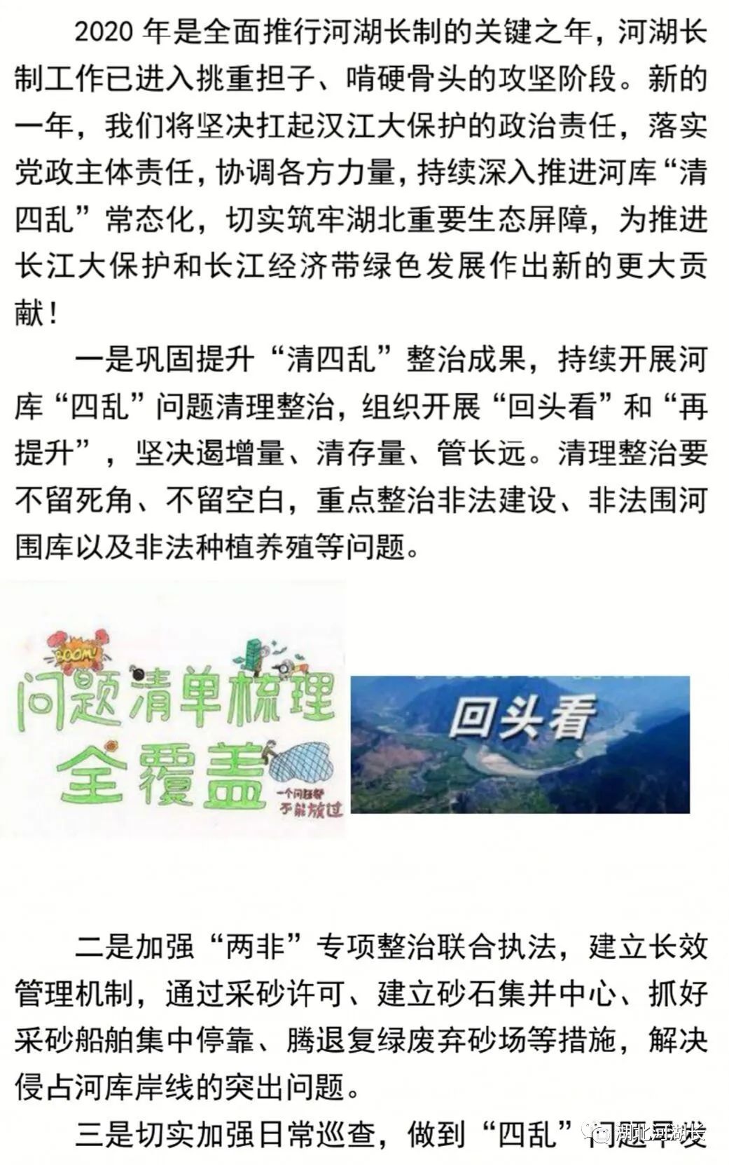 近日,水利部印发了关于深入推进河湖”清四乱”常态化规范化的通知,从提高思想认识、落实属地责任、深入自查自纠、确保立行立改、不断规范管理、加强监督检查、明确激励问责、夯实基础工作、推进智慧河湖监管、深入调查研究等十个方面提出了具体的工作要求。我们也深刻认识到,河库“清四乱”任务依然艰巨繁重,作为水利行业强监管的标志性工作,需要久久为功,持续发力。我们将认真学习文件精神,认真学习各兄弟市州的先进经验,结合襄阳实际,从继续加大自查巡查力度、扩展整治范围、规范各类建设行为的认定和处置、加快掌上河库信息系统建设和运用,健全责任体系,加大追责力度,建立更为管用的长效监管机制等方面不断加强和改进工作。我们将坚决扛起汉江大保护的政治责任,落实党政主体责任,协调各方力量,持续深入推进河库“清四乱”常态化规范化,切实筑牢湖北重要生态屏障,为推进长江大保护和长江经济带绿色发展作出新的更大贡献!