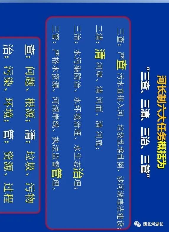 河长制可形象概括为:四个三。一是三查,查污水直排、查垃圾乱倒、查涉河违建;二是三清,清河底、清河面、清河岸;三是三治,治水污染、治水环境、治水生态;四是三管,水资源管理、河湖岸线管理、执法监督管理。