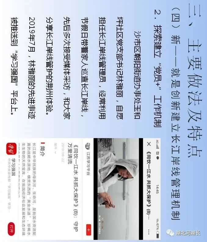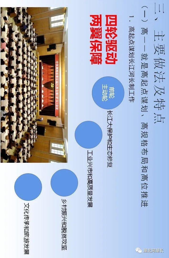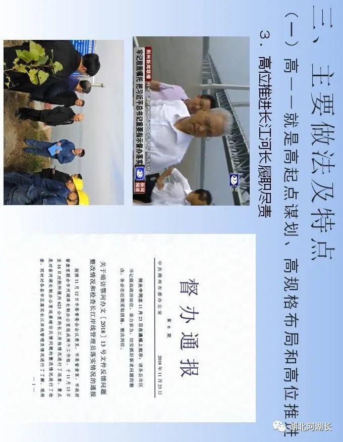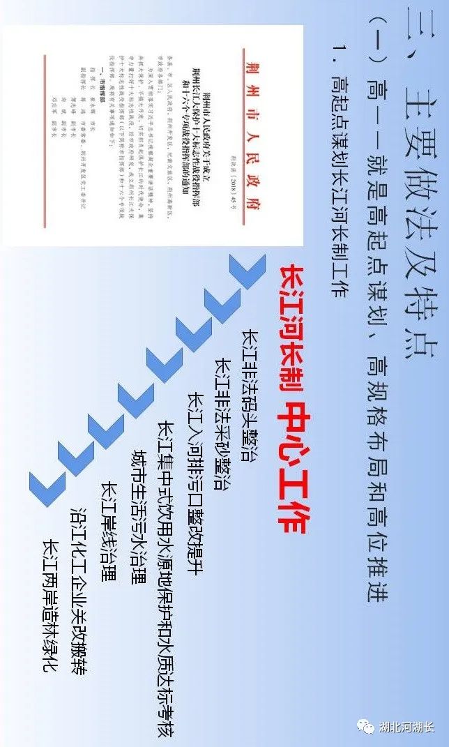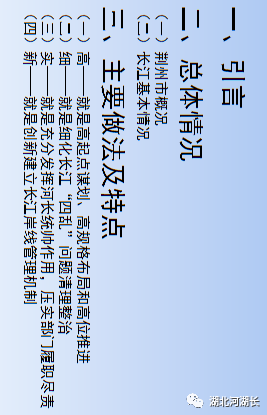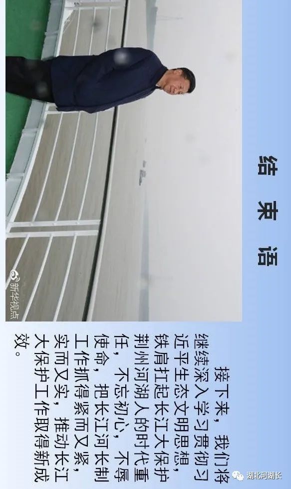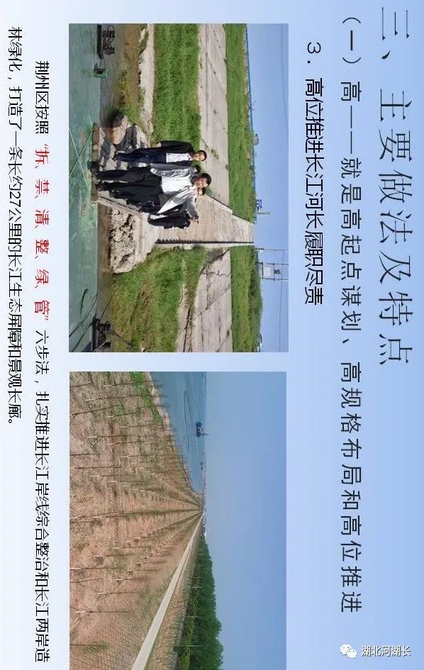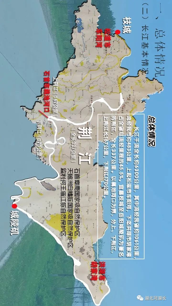 “第一,正确把握整体推进和重点突破的关系,全面做好长江生态环境保护修复工作。第二,正确把握生态环境保护和经济发展的关系,探索协同推进生态优先和绿色发展新路子。第三,正确把握总体谋划和久久为功的关系,坚定不移将一张蓝图干到底。第四,正确把握破除旧动能和培育新动能的关系,推动长江经济带建设现代化经济体系。第五,正确把握自身发展和协同发展的关系,努力将长江经济带打造成为有机融合的高效经济体。”“人心齐,泰山移。推动长江经济带发展不仅仅是沿江各地党委和政府的责任,也是全社会的共同事业,要加快形成全社会共同参与的共抓大保护、不搞大开发格局,更加有效地动员和凝聚各方面力量。”“要做好宣传舆论引导工作,营造崇尚生态文明的良好氛围。要发挥广大人民群众积极性、主动性、创造性,共同守护好母亲河。”“推动长江经济带发展,既是一场攻坚战,更是一场持久战,我们要坚定信心、咬定目标,苦干实干、久久为功,为实施好长江经济带发展战略而共同奋斗!”“我看到新华社一篇报道反映,位于长江‘九曲回肠’石首段的一家临江化工企业,产业规模居世界前三,是当地的纳税大户,但也是排污大户,严重污染问题多年难以解决,周围群众苦不堪言。这两年环保部门动真格严查,开出2700多万元的长江流域‘史上最大环保罚单’,倒逼企业关闭污染严重、难以改造的生产线,投入约1亿元引进行业最先进的治污装置,不仅解决了多年的污染问题,而且推动企业实现了转型升级,一举两得。”长江干流全长约6300公里,流经荆州市约483公里,长度仅次于重庆市(612公里),约占总径流里程8%,约占全省45.5%。荆州市,无疑给习近平总书记留下了深刻的印象,也必然寄托着他要求担当作为、走在前列的殷切期望。今天就让我们走进荆州,聆听一下荆州市各级河湖长们是如何贯彻落实习近平总书记殷殷嘱托、铁肩扛起长江大保护时代重任的。视频:荆州长江胜览