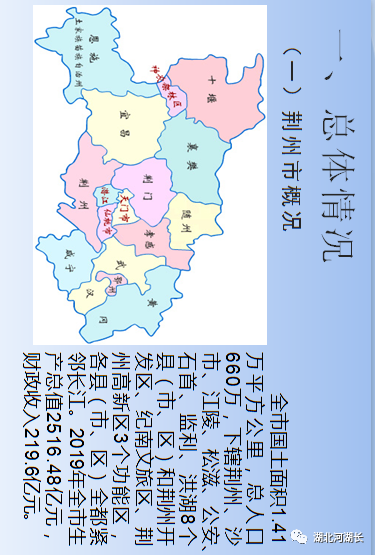 荆州市位于湖北省中南部,地处长江中游,江汉平原腹地,全市国土面积1.41万平方公里,总人口660万,下辖荆州、沙市、江陵、松滋、公安、石首、监利、洪湖8个县(市、区)和荆州开发区、纪南文旅区、荆州高新区3个功能区,各县(市、区)全都紧邻长江。2019年全市生产总值2516.48亿元,财政收入219.6亿元。长江干流全长约6300公里,流经荆州约483公里,上起松滋车阳河,下迄洪湖胡家湾,从宜昌枝城至岳阳城陵矶为著名的荆江,长337公里。锦绣荆江,九曲回肠,就像一位美貌的仙子,在荆州这块风水宝地上尽情地轻歌漫舞,造化了石首麋鹿国家级自然保护区、天鹅洲白鳍豚国家级自然保护区、监利何王庙江豚自然保护区,赐予了荆州新的时代灵气!